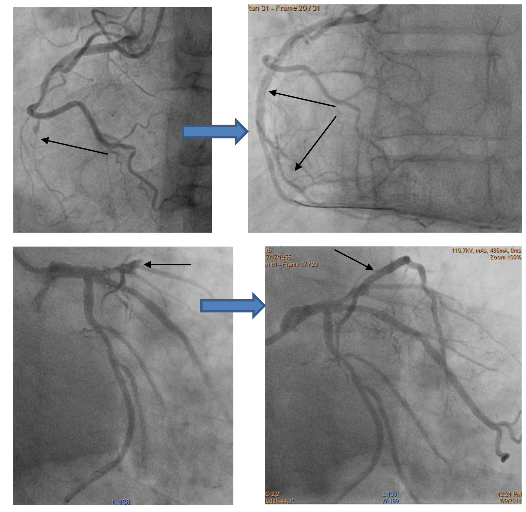 Ниже приводится пример успешной реканализации и стентирования двух хронических окклюзий разных коронарных артерий у пациента с ишемической болезнью сердца, выполненных к тому же за одну процедуру. Самочувствие пациента в результате вмешательства значительно улучшилось. Стентирование выполнено лучевым доступом.