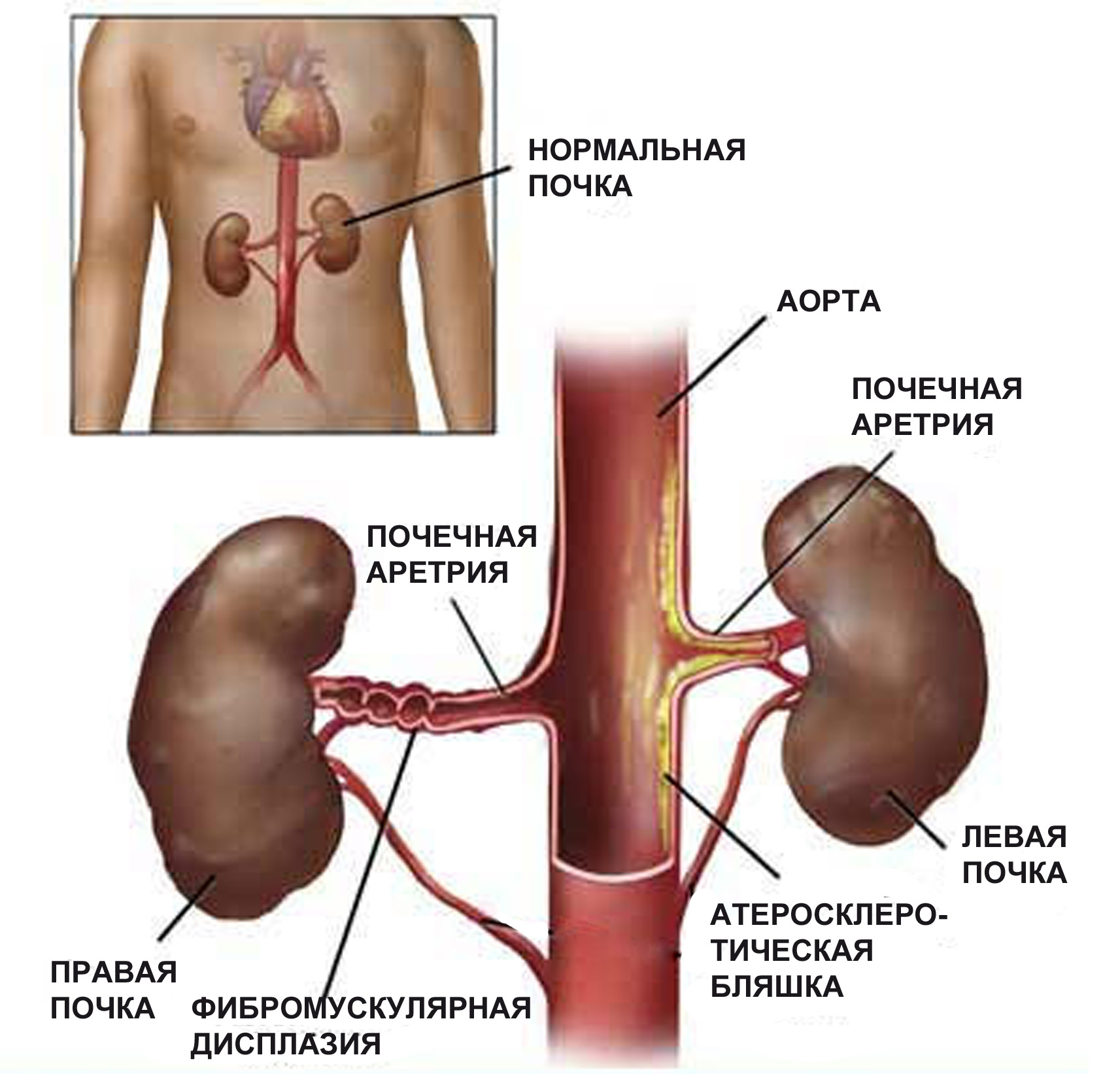 Однако, в некоторых случаях гипертония возникает вследствие нарушения кровоснабжения почек – причины, которую можно радикально устранить. Причиной в таких ситуациях чаще всего бывает сужение почечной артерии атеросклеротической бляшкой, либо вследствие врожденного дефекта развития стенок артерии (фибромускулярная дисплазия). Такое заболевание называется вазоренальная (реноваскулярная) гипертония либо почечная гипертония.