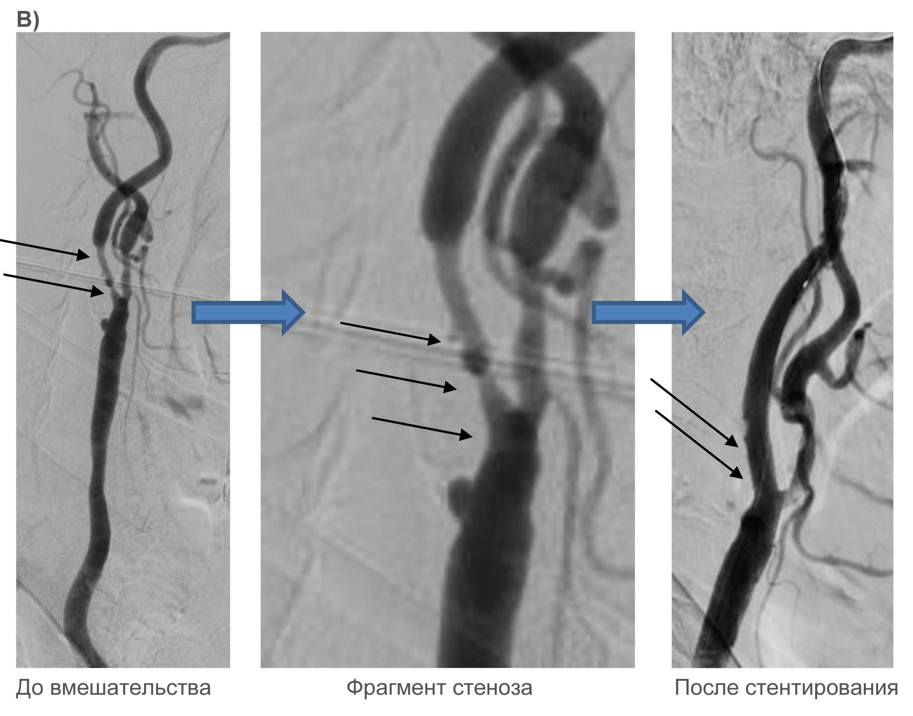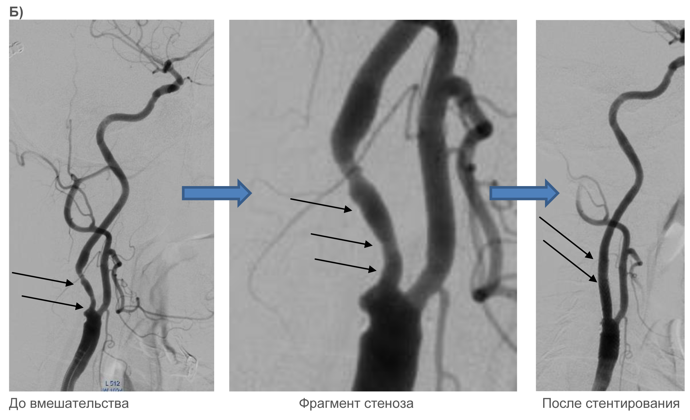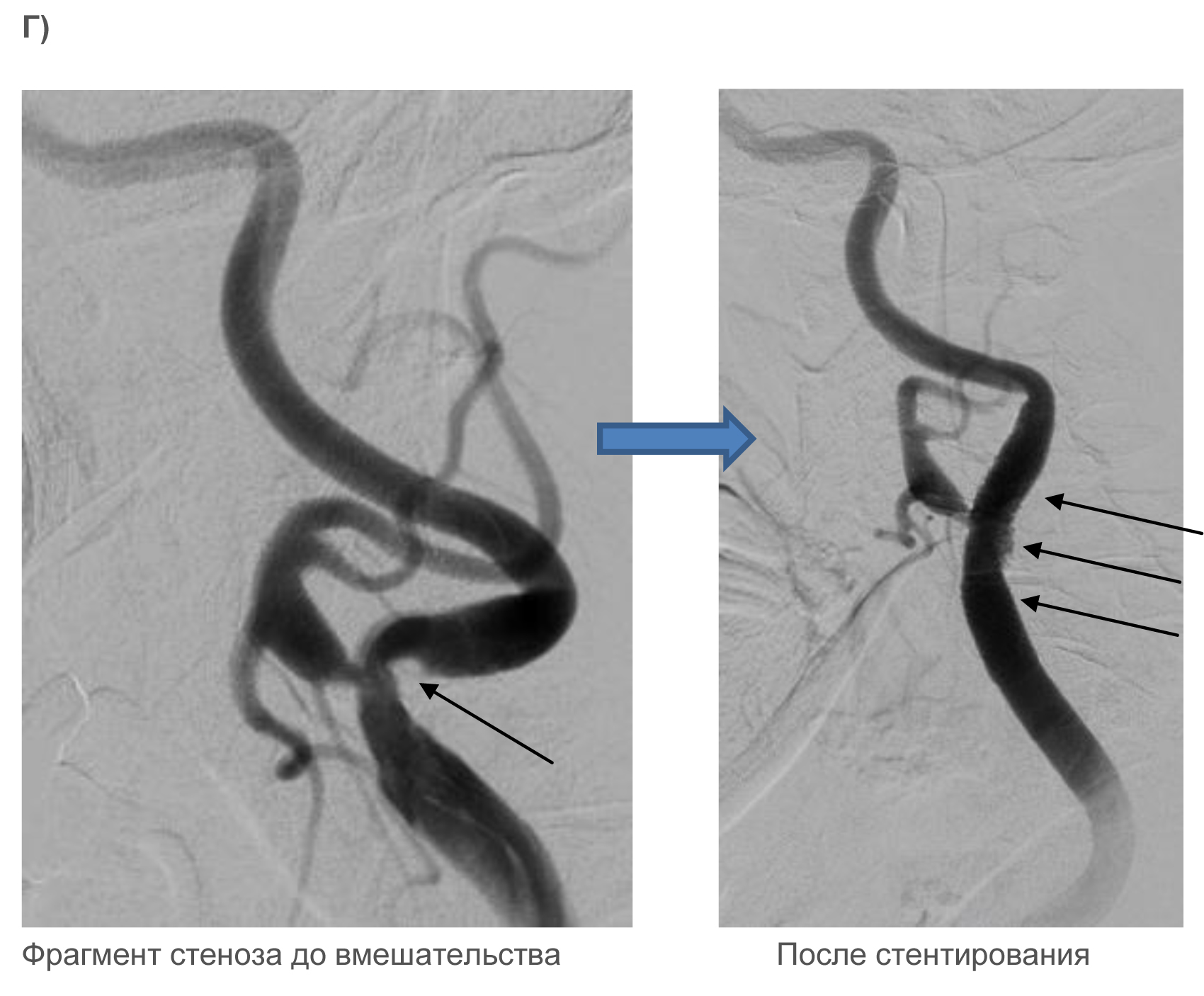 Для иллюстрации клинических примеров выполненных стентирований сонных артерий отсутствует необходимость подробного описания состояния пациентов до и после проведенного вмешательства, т.к. самочувствие пациента может значимо не меняться. Основной целью вмешательства является профилактика инсульта.