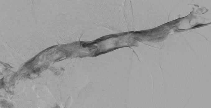 Финальный результат катетер-управляемого тромболизиса – полное восстановление кровотока с растворением всех тромбов в исходно тотально тромбированной поверхностной бедренной вене.