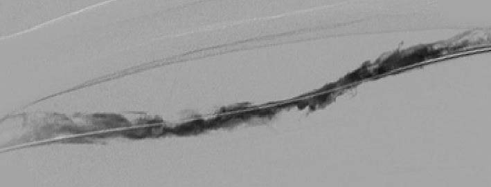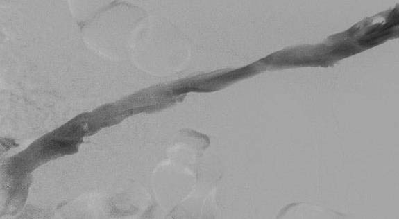 Промежуточный результат катетер-управляемого тромболизиса – появление минимального кровотока в исходно тотально тромбированной поверхностной бедренной вене.