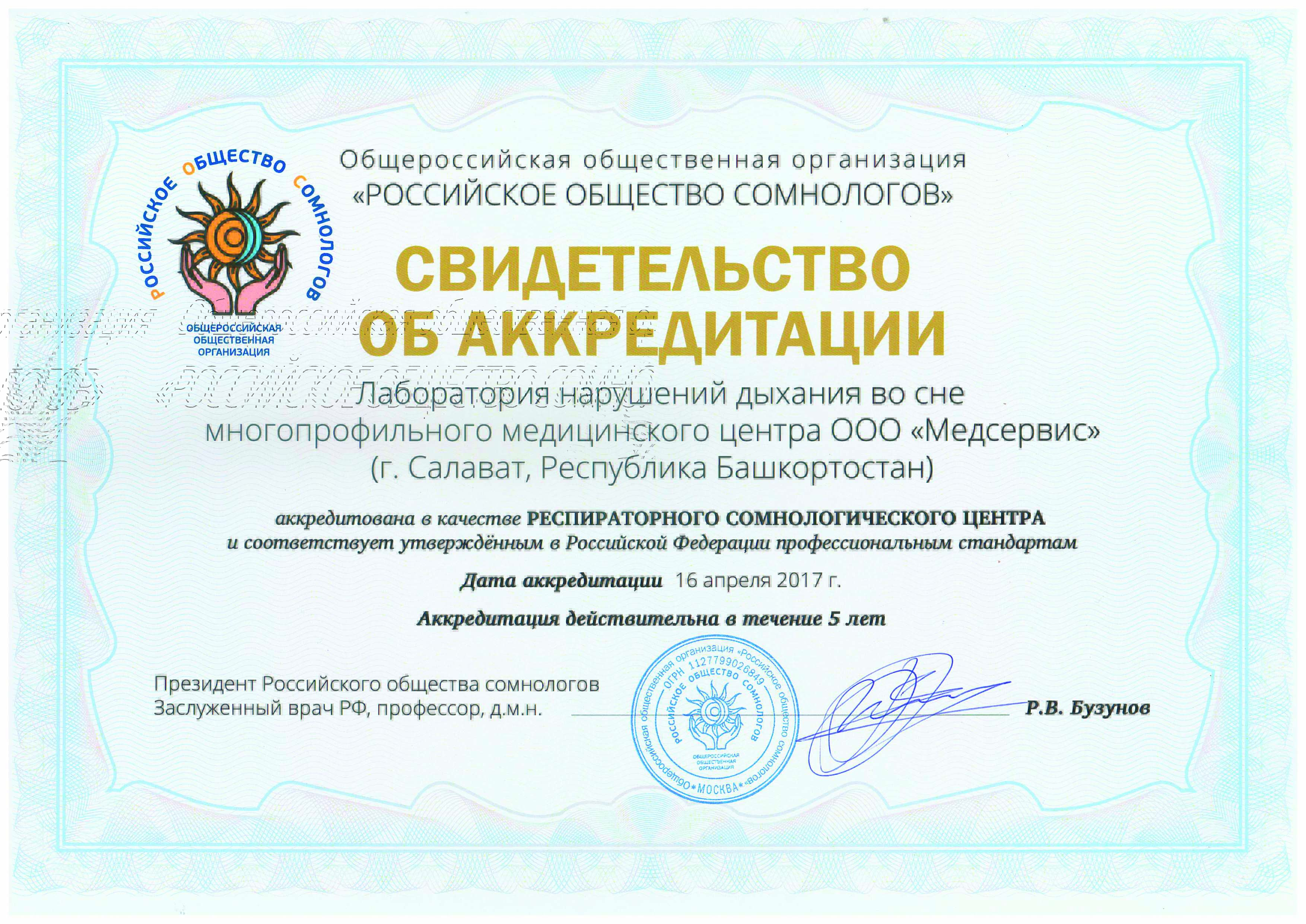 Аккредитационный комитет Российского общества сомнологов 16 апреля 2017 г. принял решение об аккредитации в качестве респираторного сомнологического центра лаборатории нарушений дыхания во сне многопрофильного медицинского центра «Медсервис».